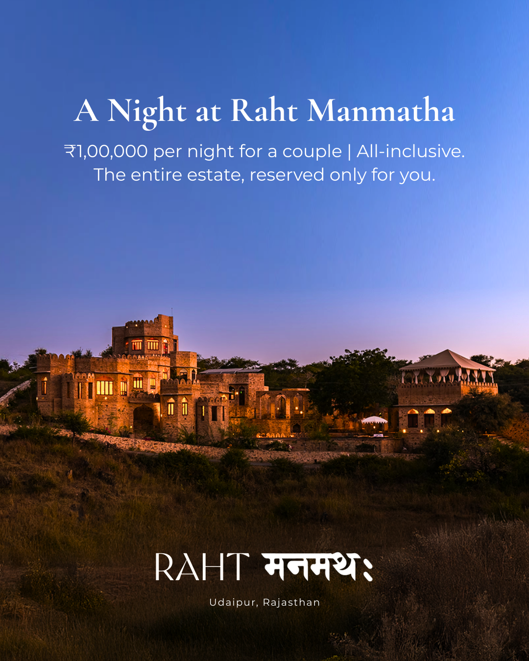 A 4-day Republic Day weekend escape for adult couples in Udaipur. Private villas, spa rituals, aphrodisiac dining & complete seclusion at Raht Manmatha.