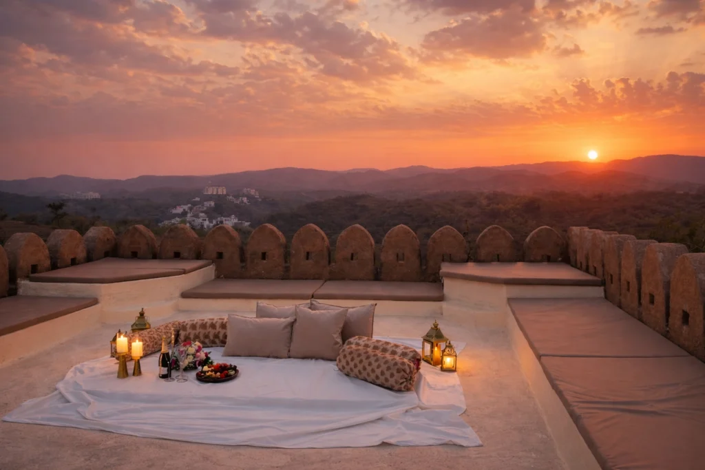 Experience a private sundowner at Raht Manmatha near Udaipur with sunset views, artisanal platters, and intimate terrace settings.