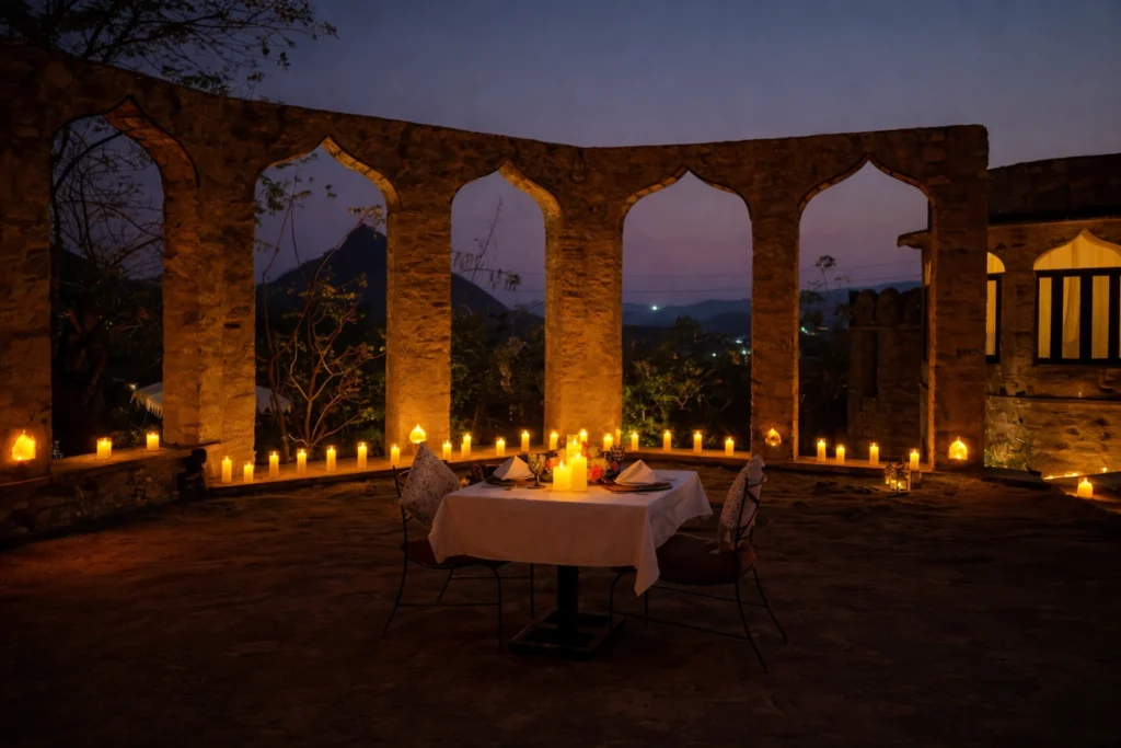 Plan an unforgettable proposal at Raht Manmatha, a private heritage estate near Udaipur with candlelit terraces, sunset views, and curated experiences.
