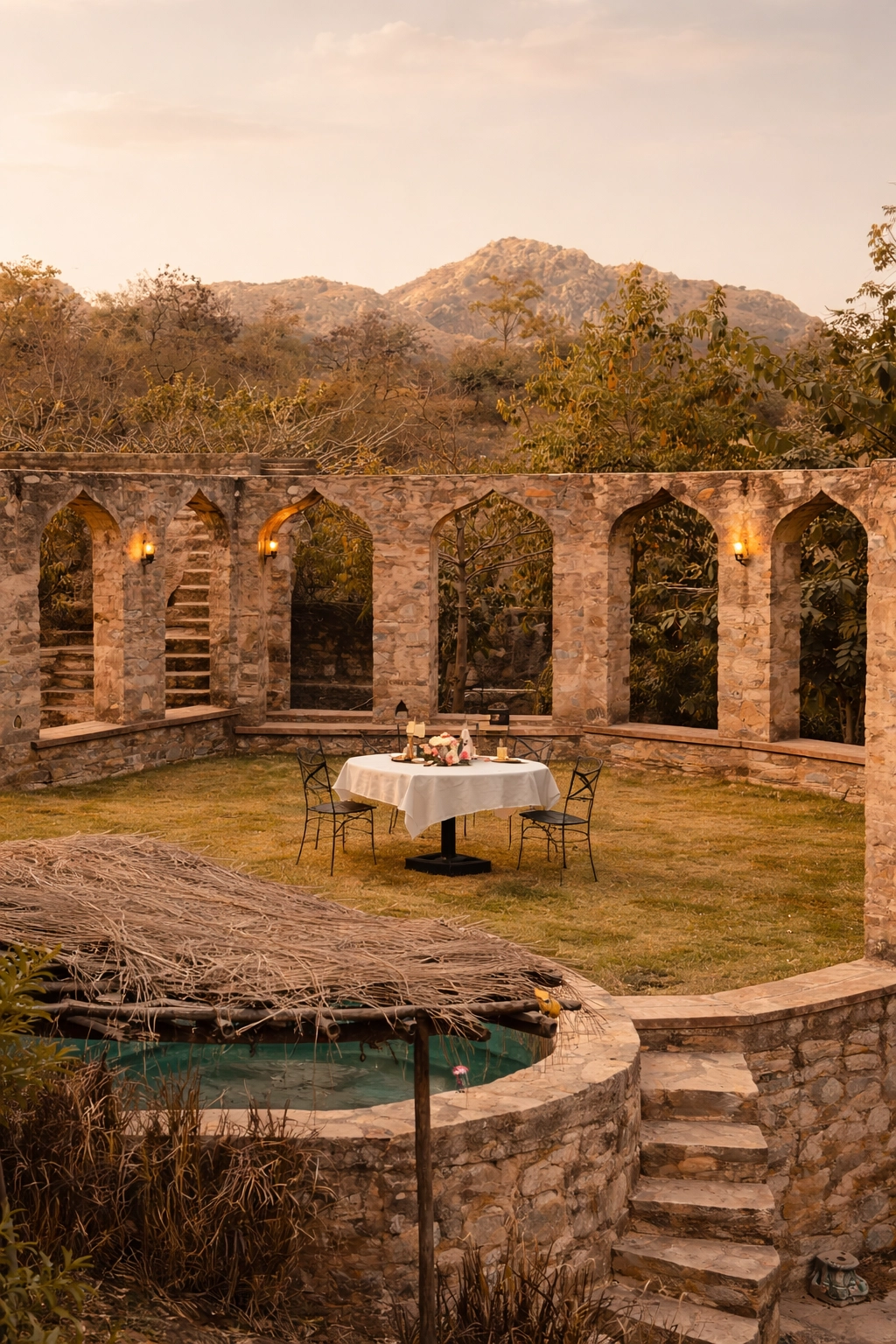 Sunset terraces overlooking the Aravalli hills