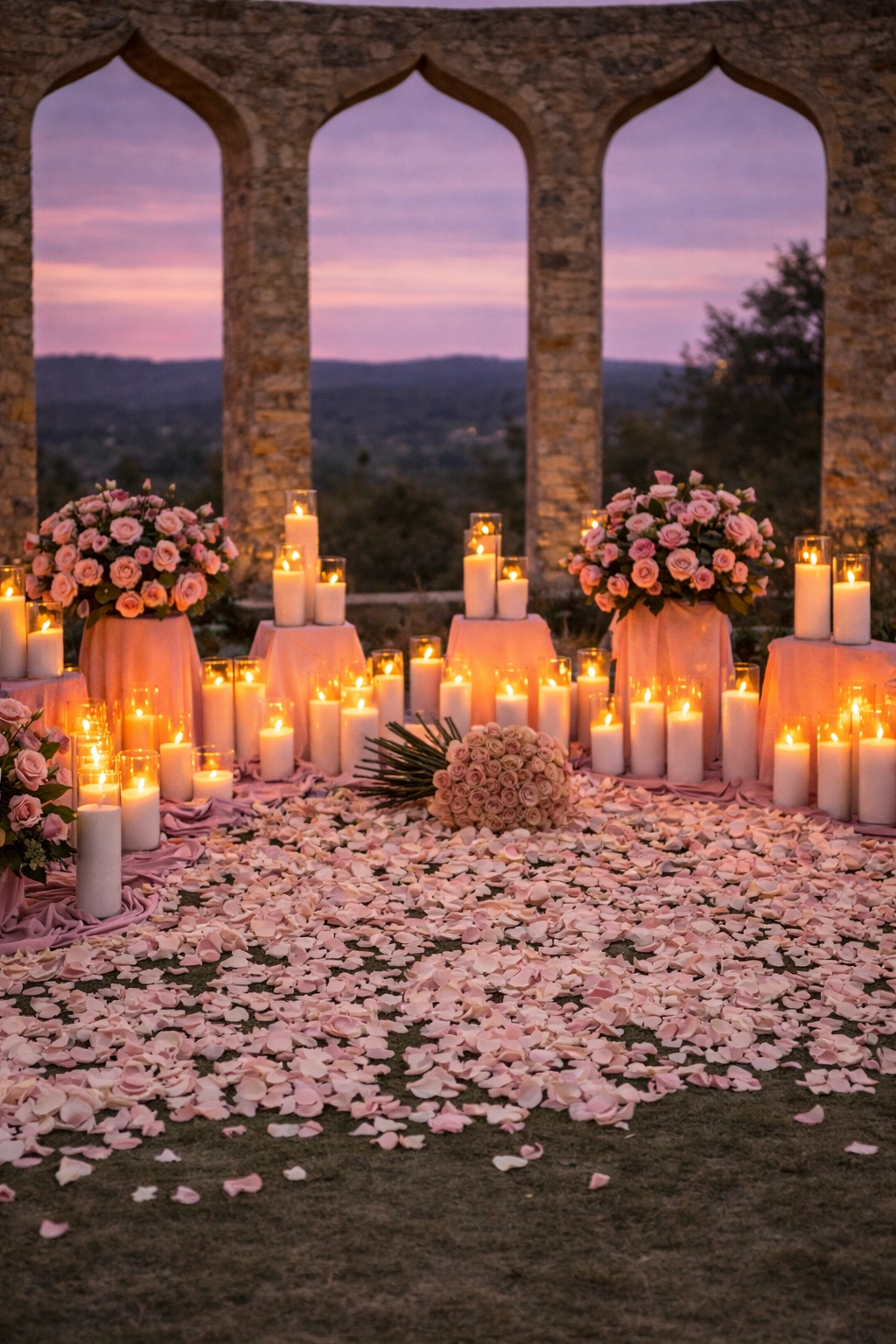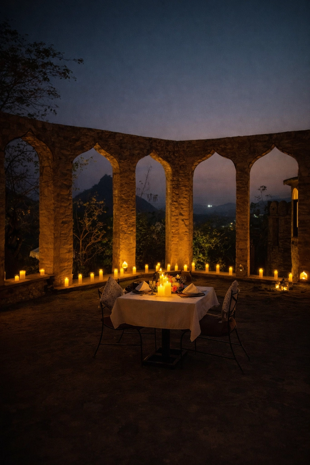 Candlelit courtyards framed by heritage arches